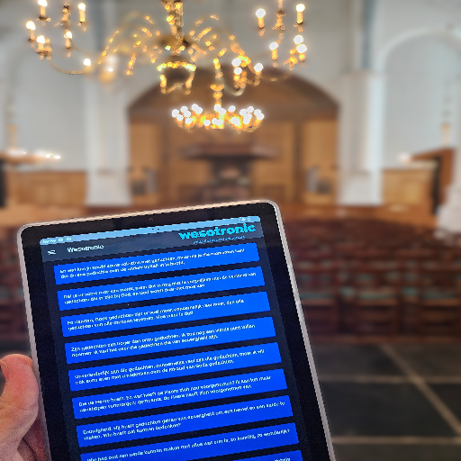 De preek wordt real-time omgezet naar tekst. Bezoekers lezen mee op hun eigen apparaat en kunnen lettergrootte en contrast aanpassen.